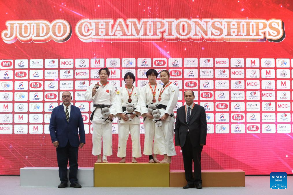 Gold medalist Honda Mayu (3rd L) of Japan, silver medalist Feng Yingying (2nd L) of China, bronze medalist Mun Song Hui (3rd R) of the Democratic People's Republic of Korea (DPRK) and bronze medalist Nyam-Erdene Batsuuri (2nd R) of Mongolia pose for photos during the awarding ceremony after the women's -70 kg final at the Asian Judo Championships in Bangkok, Thailand, April 26, 2025. (Xinhua/Rachen Sageamsak)