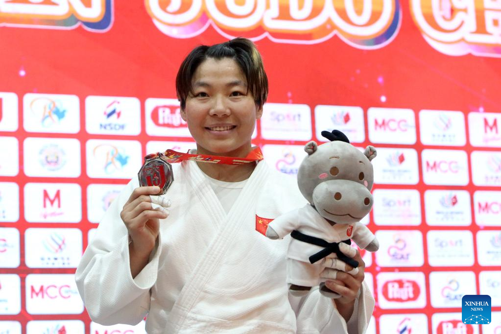 Silver medalist Feng Yingying of China poses during the awarding ceremony after the women's -70 kg final at the Asian Judo Championships in Bangkok, Thailand, April 26, 2025. (Xinhua/Rachen Sageamsak)