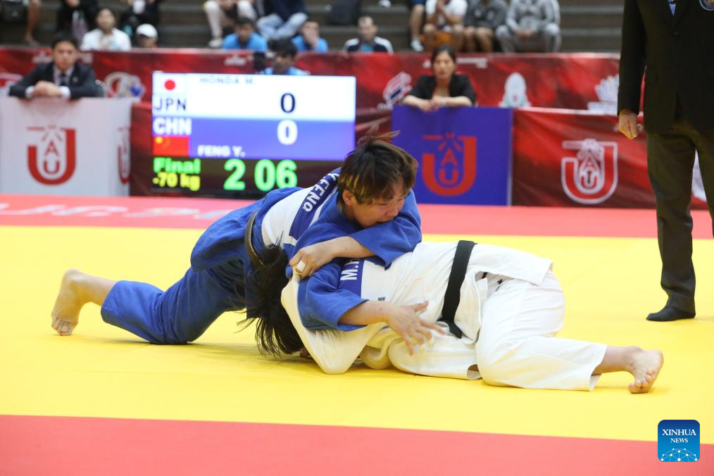 Feng Yingying (L) of China competes against Honda Mayu of Japan during the women's -70 kg final at the Asian Judo Championships in Bangkok, Thailand, April 26, 2025. (Xinhua/Rachen Sageamsak)