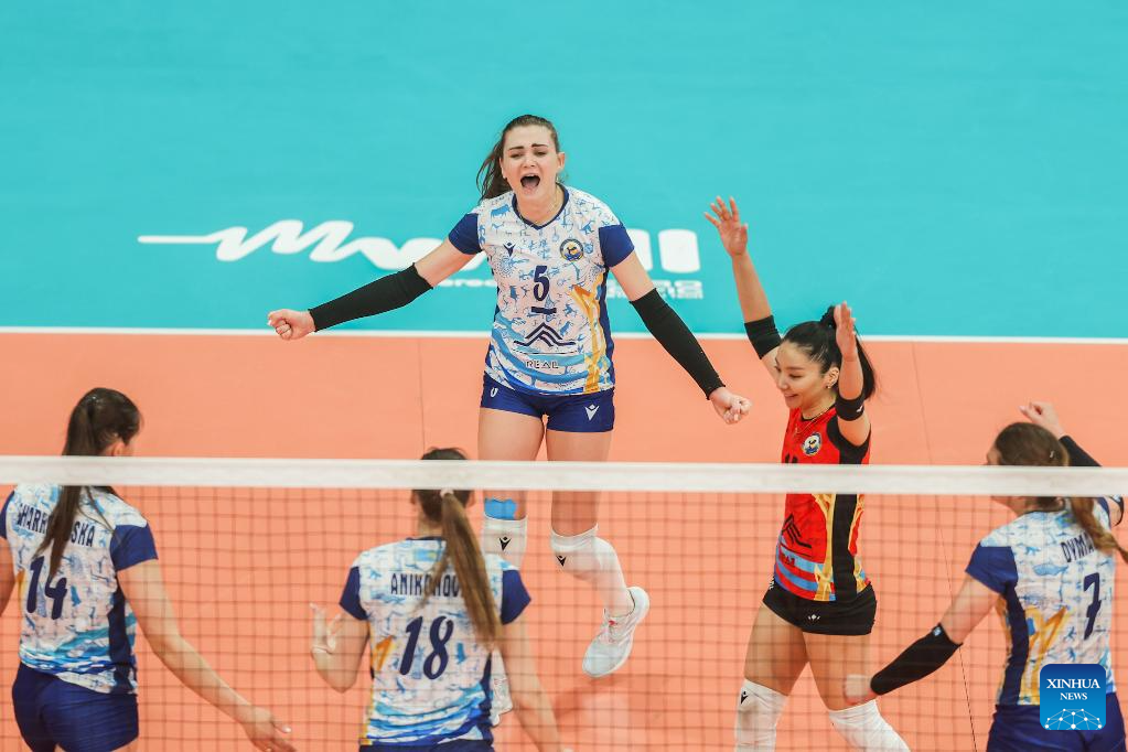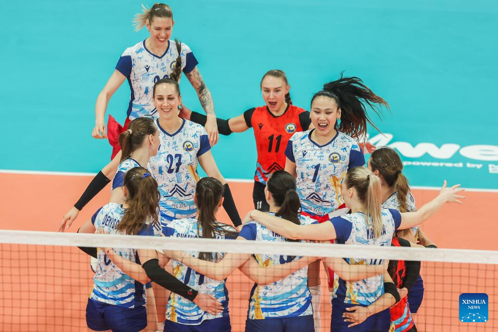 Players of Kazakhstan's Zhetysu VC celebrate during the semifinal match between Kazakhstan's Zhetysu VC and Thailand's Nakhon Ratchasima Qmin C VC at the AVC Women's Volleyball Champions League in Pasig City, the Philippines, April 26, 2025. (Xinhua/Rouelle Umali)