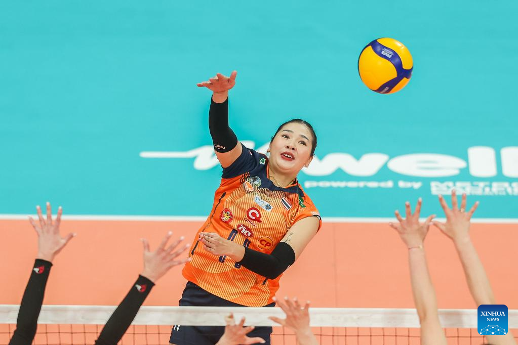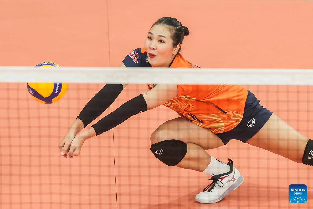 Sasipapron Janthawisut of Thailand's Nakhon Ratchasima Qmin C VC competes during the semifinal match between Kazakhstan's Zhetysu VC and Thailand's Nakhon Ratchasima Qmin C VC at the AVC Women's Volleyball Champions League in Pasig City, the Philippines, April 26, 2025. (Xinhua/Rouelle Umali)