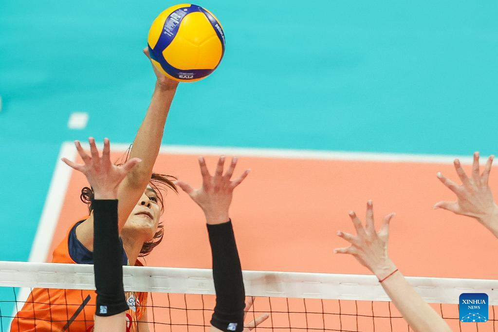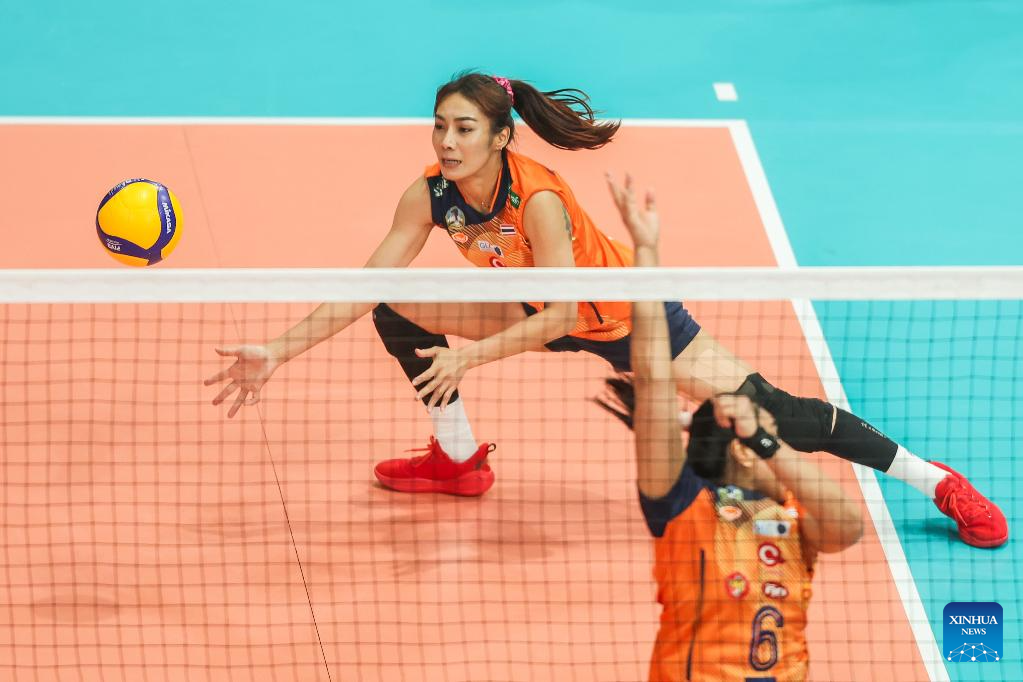 Kaewkalaya Kamulthala (back) of Thailand's Nakhon Ratchasima Qmin C VC competes during the semifinal match between Kazakhstan's Zhetysu VC and Thailand's Nakhon Ratchasima Qmin C VC at the AVC Women's Volleyball Champions League in Pasig City, the Philippines, April 26, 2025. (Xinhua/Rouelle Umali)