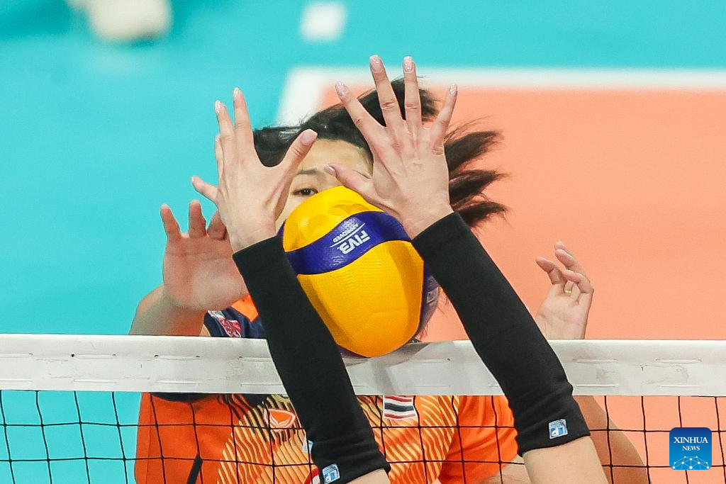 Waruni Kanram (back) of Thailand's Nakhon Ratchasima Qmin C VC competes during the semifinal match between Kazakhstan's Zhetysu VC and Thailand's Nakhon Ratchasima Qmin C VC at the AVC Women's Volleyball Champions League in Pasig City, the Philippines, April 26, 2025. (Xinhua/Rouelle Umali)