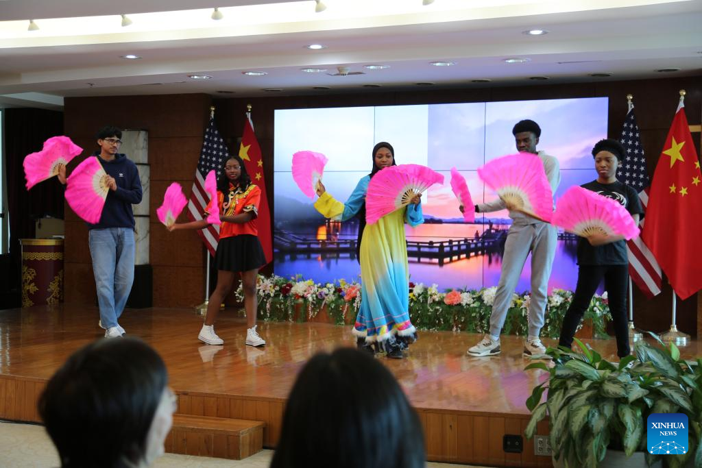 Students perform a fan dance during a Chinese Language Day celebration event in New York, the United States, April 25, 2025. Over 200 students and educators from New York, New Jersey and Connecticut celebrated Chinese Language Day at a thematic event hosted by the Chinese Consulate General in New York on Friday.