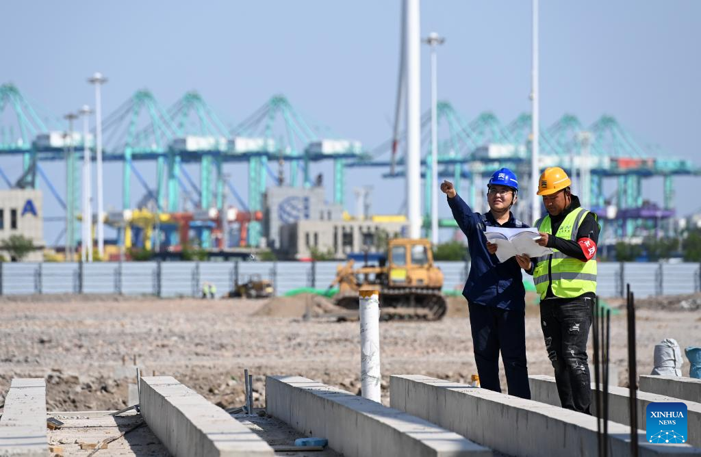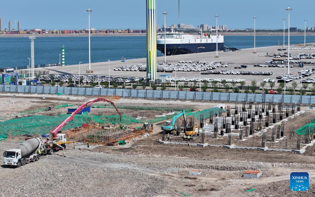 Workers work at the construction site of a vehicle logistics yard of the international ro-ro terminal of Tianjin Port in north China's Tianjin, April 25, 2025.