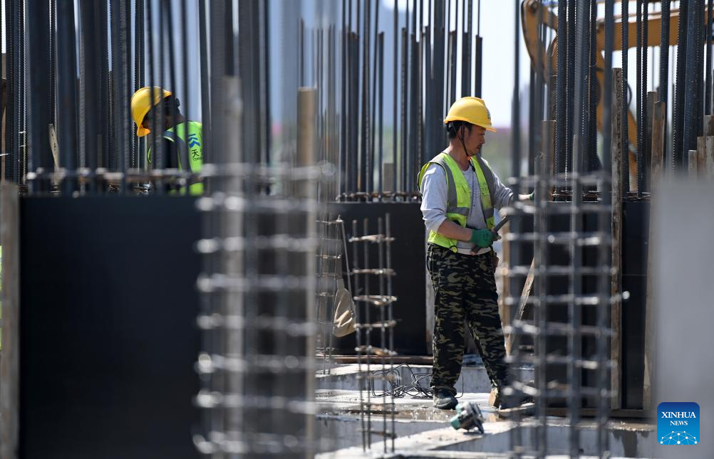 A worker works at the construction site of a new grain silo project of Tianjin Port in north China's Tianjin, April 25, 2025.