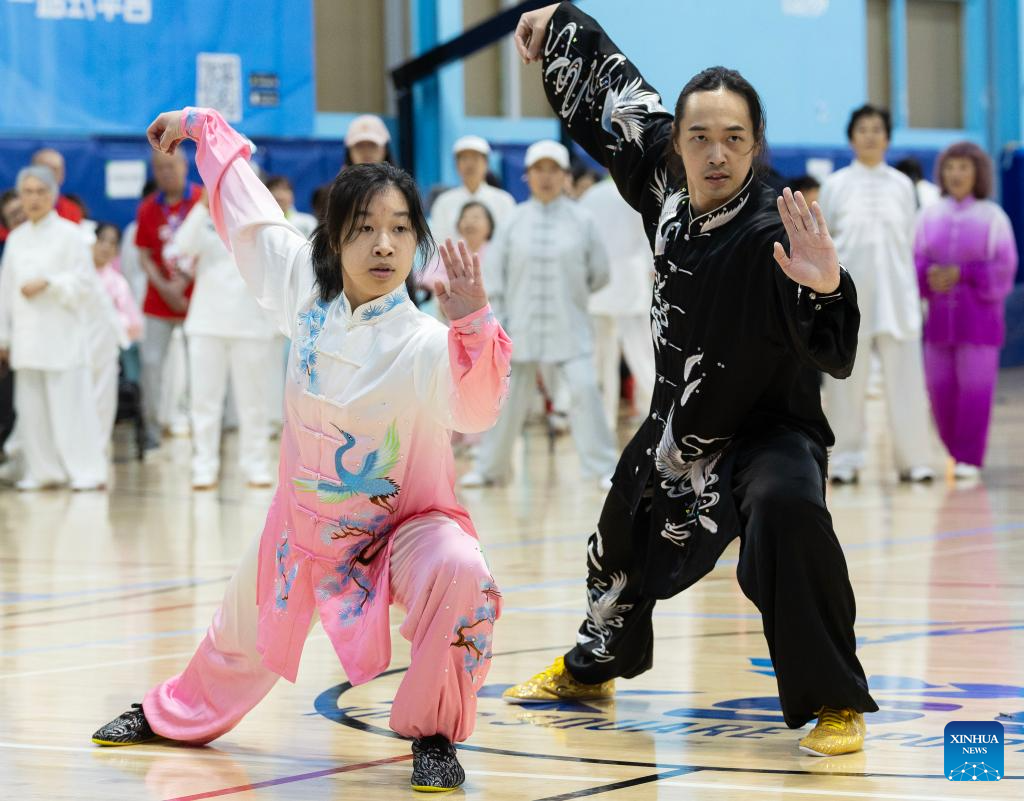 People demonstrate Tai Chi together to celebrate World Tai Chi Day during the 2025 Can-Am Martial Arts Championships in Richmond, British Columbia, Canada, April 26, 2025. The World Tai Chi Day falls on the last Saturday of April. (Photo by Liang Sen/Xinhua)