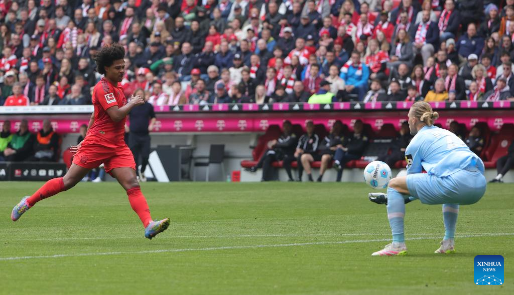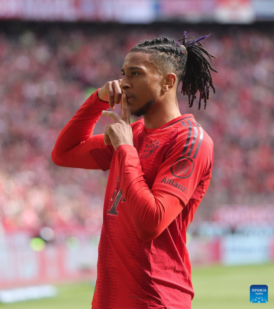 Michael Olise of Bayern Munich celebrates his goal during the German first division Bundesliga football match between Bayern Munich and FSV Mainz 05 in Munich, Germany, April 26, 2025. (Photo by Philippe Ruiz/Xinhua)
