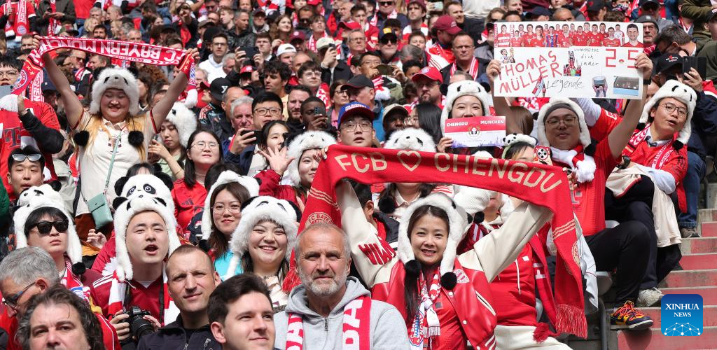 Fans cheer for Bayern Munich during the German first division Bundesliga football match between Bayern Munich and FSV Mainz 05 in Munich, Germany, April 26, 2025. (Photo by Philippe Ruiz/Xinhua)