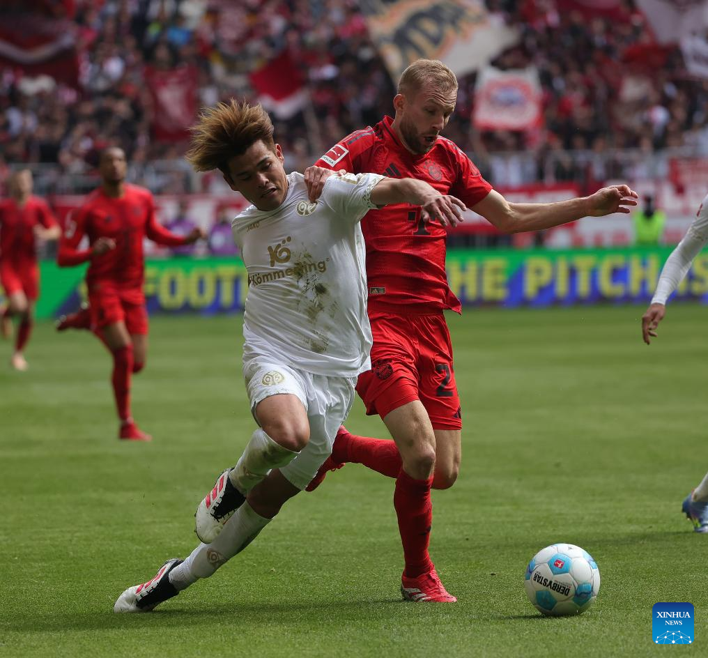 Konrad Laimer (R) of Bayern Munich vies with Kaishu Sano of FSV Mainz 05 during the German first division Bundesliga football match between Bayern Munich and FSV Mainz 05 in Munich, Germany, April 26, 2025. (Photo by Philippe Ruiz/Xinhua)