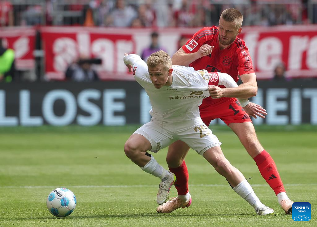 Eric Dier (R) of Bayern Munich vies with Jonathan Burkardt of FSV Mainz 05 during the German first division Bundesliga football match between Bayern Munich and FSV Mainz 05 in Munich, Germany, April 26, 2025. (Photo by Philippe Ruiz/Xinhua)