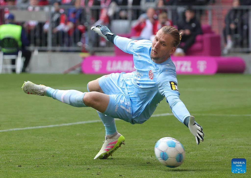 FSV Mainz 05's goalkeeper Robin Zentner fails to make a save during the German first division Bundesliga football match between Bayern Munich and FSV Mainz 05 in Munich, Germany, April 26, 2025. (Photo by Philippe Ruiz/Xinhua)