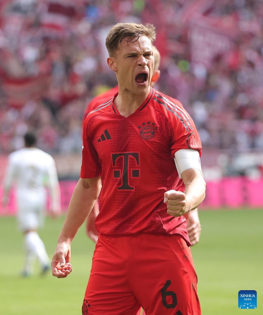 Joshua Kimmich of Bayern Munich celebrates his team's second goal during the German first division Bundesliga football match between Bayern Munich and FSV Mainz 05 in Munich, Germany, April 26, 2025. (Photo by Philippe Ruiz/Xinhua)