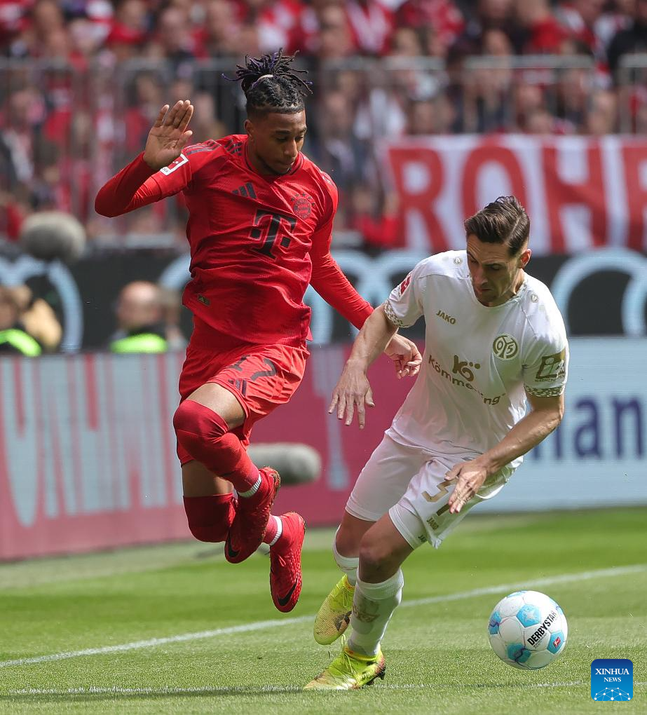 Michael Olise (L) of Bayern Munich vies with Dominik Kohr of FSV Mainz 05 during the German first division Bundesliga football match between Bayern Munich and FSV Mainz 05 in Munich, Germany, April 26, 2025. (Photo by Philippe Ruiz/Xinhua)