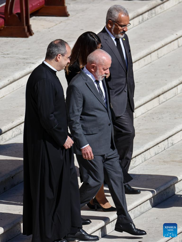 Brazilian President Luiz Inacio Lula da Silva (R, front) arrives for Pope Francis's funeral at St. Peter's Square in Vatican on April 26, 2025. Pope Francis, the 266th pontiff of the Roman Catholic Church, died Monday at the age of 88. (Xinhua/Li Jing)