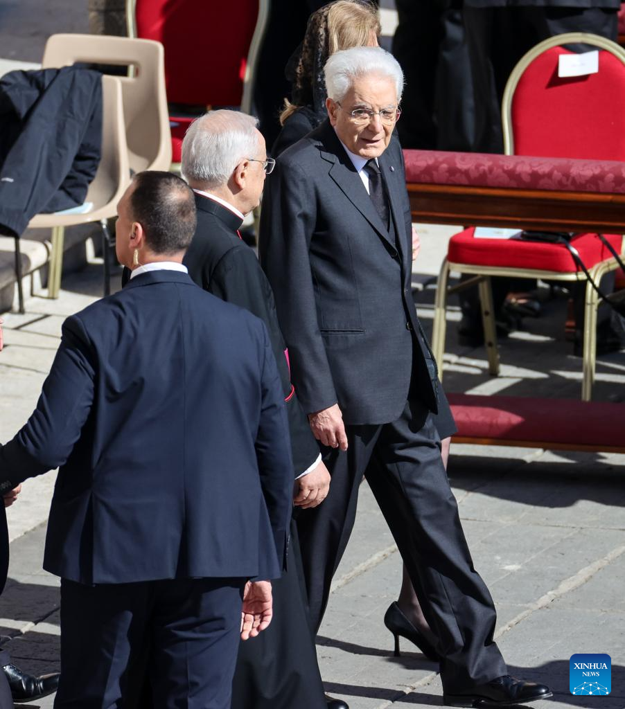 Italian President Sergio Mattarella arrives for Pope Francis's funeral at St. Peter's Square in Vatican on April 26, 2025. Pope Francis, the 266th pontiff of the Roman Catholic Church, died Monday at the age of 88. (Xinhua/Li Jing)