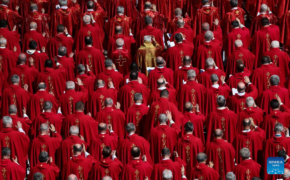 Members of the clergy attend Pope Francis's funeral at St. Peter's Square in Vatican on April 26, 2025. Pope Francis, the 266th pontiff of the Roman Catholic Church, died Monday at the age of 88. (Xinhua/Li Jing)