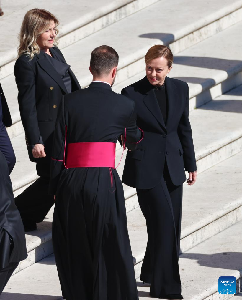 Italian Prime Minister Giorgia Meloni (R) arrives for Pope Francis's funeral at St. Peter's Square in Vatican on April 26, 2025. Pope Francis, the 266th pontiff of the Roman Catholic Church, died Monday at the age of 88. (Xinhua/Li Jing)