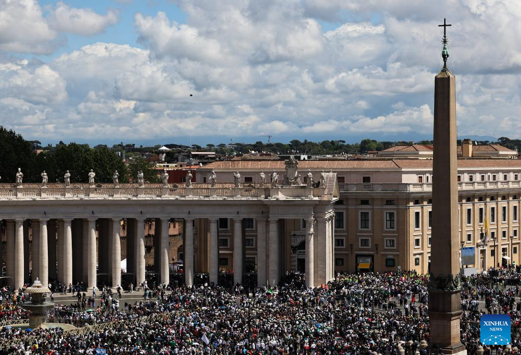 This photo taken on April 26, 2025 shows a scene during Pope Francis's funeral at St. Peter's Square in Vatican. Pope Francis, the 266th pontiff of the Roman Catholic Church, died Monday at the age of 88. (Xinhua/Li Jing)