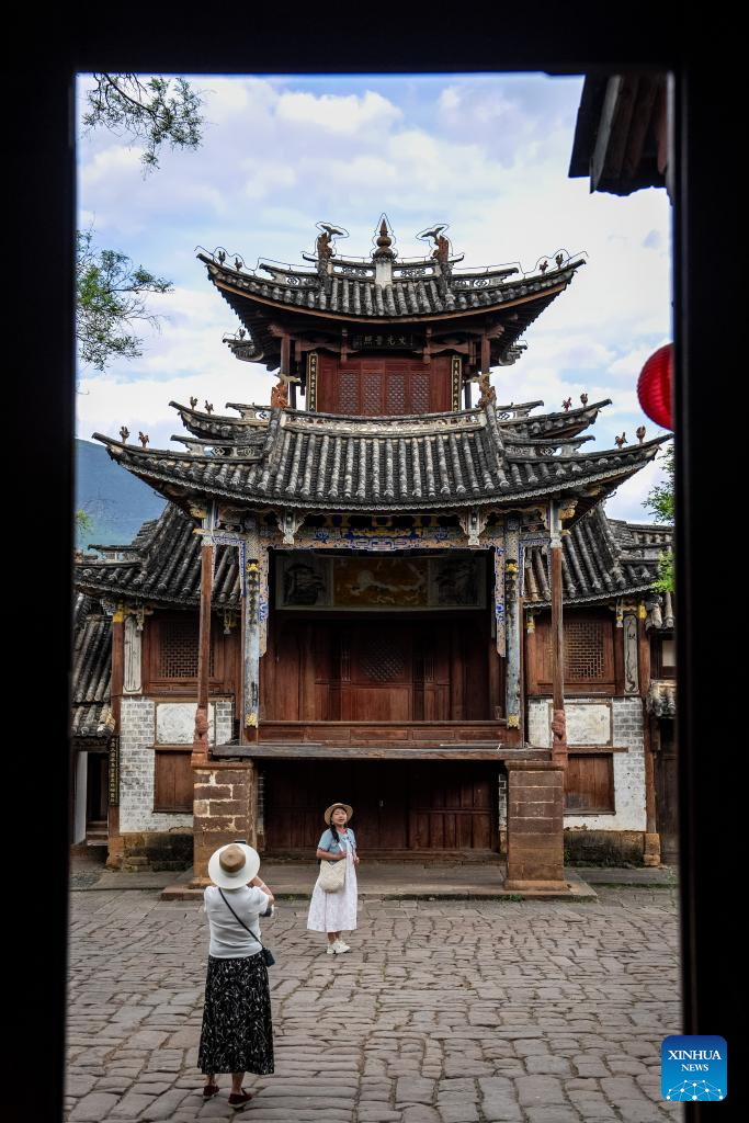 People visit an ancient stage at Sideng Village of Shaxi Town, Jianchuan County, southwest China's Yunnan Province, April 21, 2025. A remote town in Jianchuan County, Shaxi was once an important trading hub for tea, herbs, silks and salt on the ancient Tea Horse Road, a trade route dating back to the Tang Dynasty (618-907).
