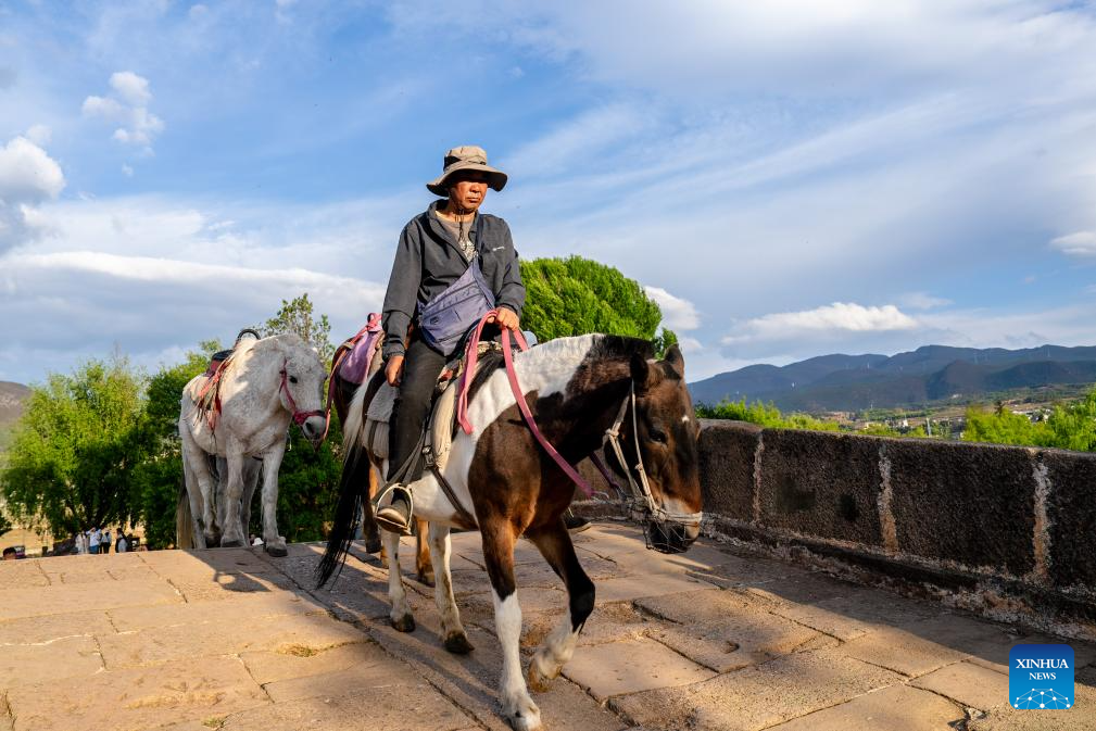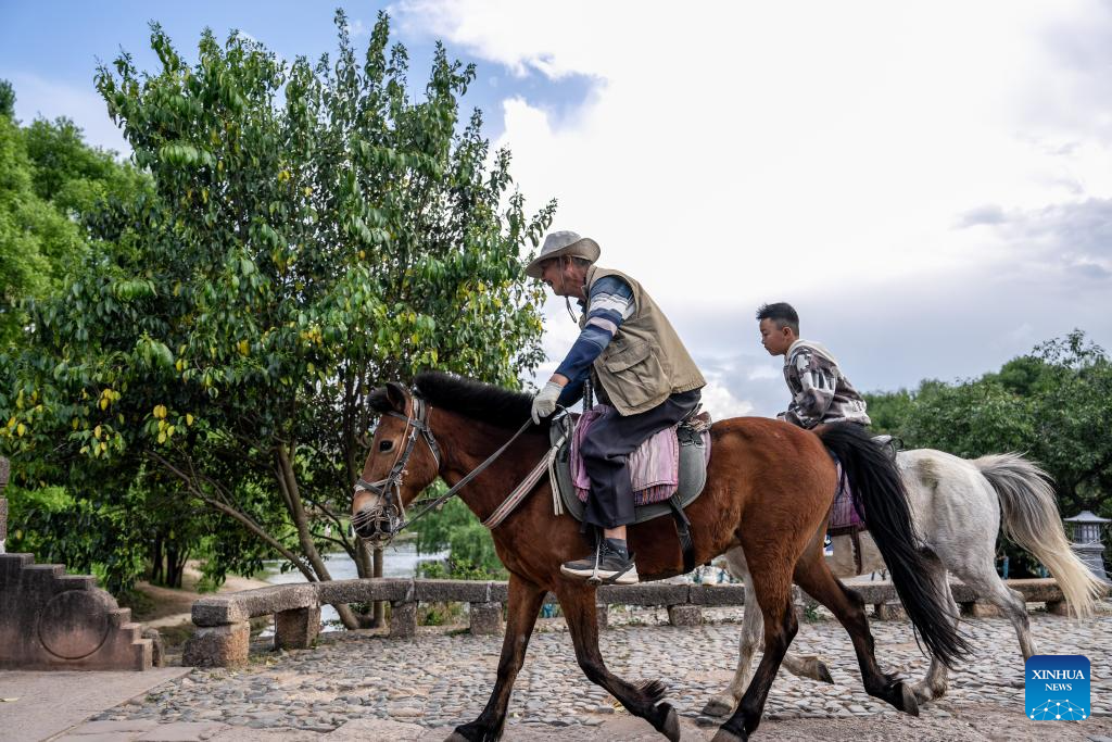 People on horseback are pictured at Sideng Village of Shaxi Town, Jianchuan County, southwest China's Yunnan Province, April 19, 2025. A remote town in Jianchuan County, Shaxi was once an important trading hub for tea, herbs, silks and salt on the ancient Tea Horse Road, a trade route dating back to the Tang Dynasty (618-907).