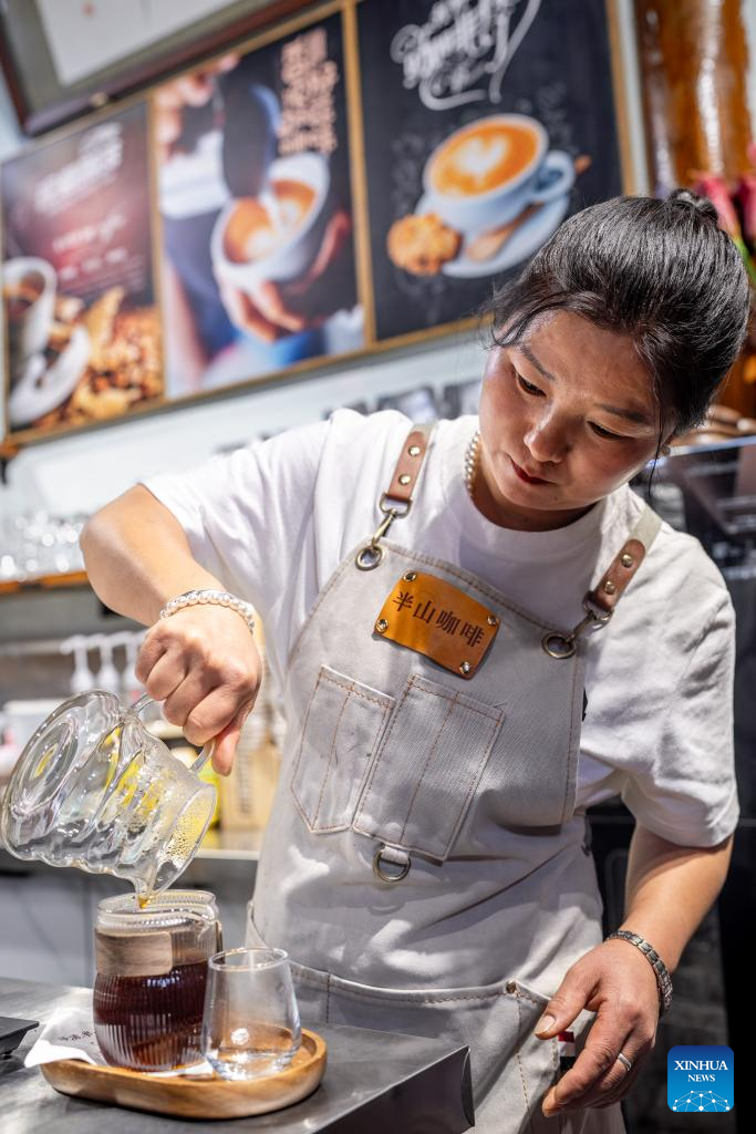 A villager brews coffee at Hualong Village of Shaxi Town, Jianchuan County, southwest China's Yunnan Province, April 20, 2025. A remote town in Jianchuan County, Shaxi was once an important trading hub for tea, herbs, silks and salt on the ancient Tea Horse Road, a trade route dating back to the Tang Dynasty (618-907).