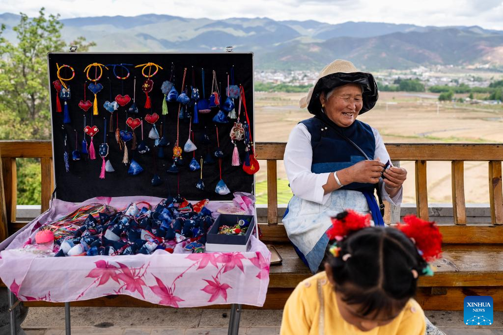 An elderly woman of Bai ethnic group arranges embroidered sachets at Hualong Village of Shaxi Town, Jianchuan County, southwest China's Yunnan Province, April 20, 2025. A remote town in Jianchuan County, Shaxi was once an important trading hub for tea, herbs, silks and salt on the ancient Tea Horse Road, a trade route dating back to the Tang Dynasty (618-907).