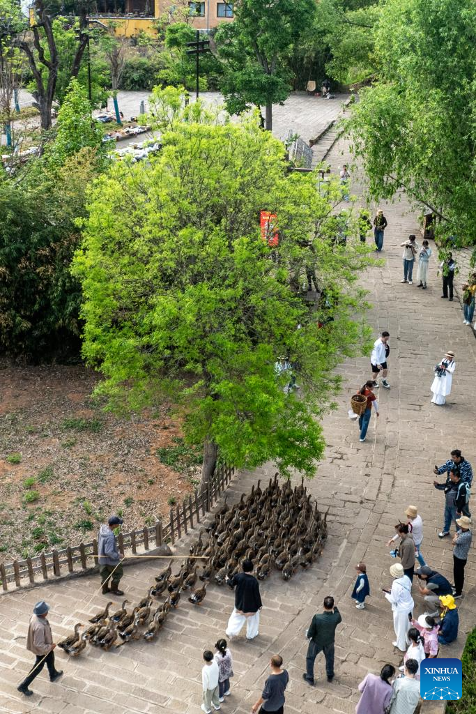 An aerial drone photo taken on April 19, 2025 shows villagers driving a flock of ducks at Sideng Village of Shaxi Town, Jianchuan County, southwest China's Yunnan Province. A remote town in Jianchuan County, Shaxi was once an important trading hub for tea, herbs, silks and salt on the ancient Tea Horse Road, a trade route dating back to the Tang Dynasty (618-907).