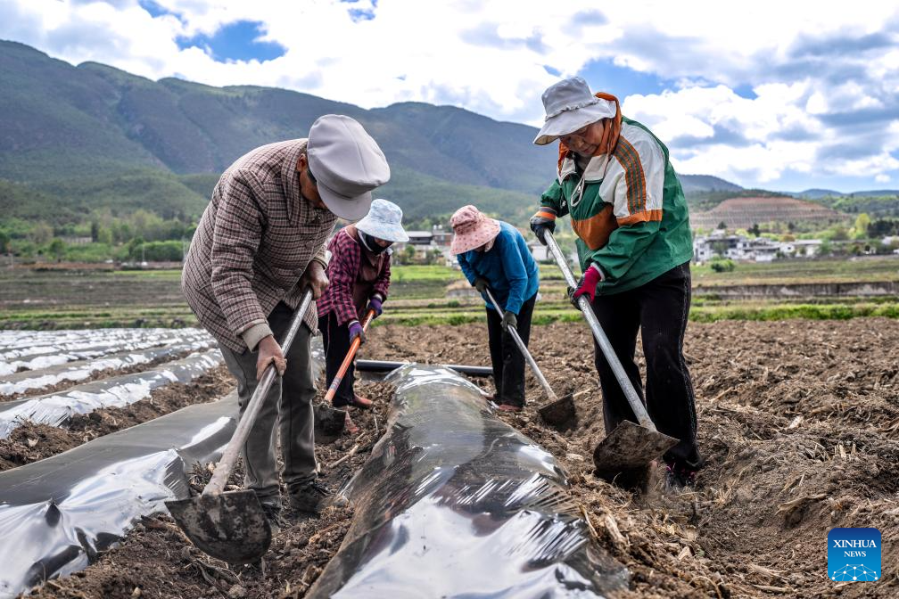 Villagers work in the field in Beilong Village of Shaxi Town, Jianchuan County, southwest China's Yunnan Province, April 20, 2025. A remote town in Jianchuan County, Shaxi was once an important trading hub for tea, herbs, silks and salt on the ancient Tea Horse Road, a trade route dating back to the Tang Dynasty (618-907).