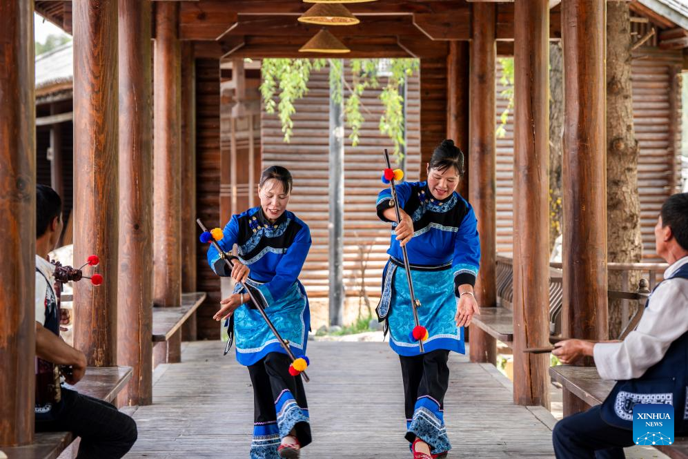Villagers practice a folk dance in Shilong Village of Shaxi Town, Jianchuan County, southwest China's Yunnan Province, April 19, 2025. A remote town in Jianchuan County, Shaxi was once an important trading hub for tea, herbs, silks and salt on the ancient Tea Horse Road, a trade route dating back to the Tang Dynasty (618-907).