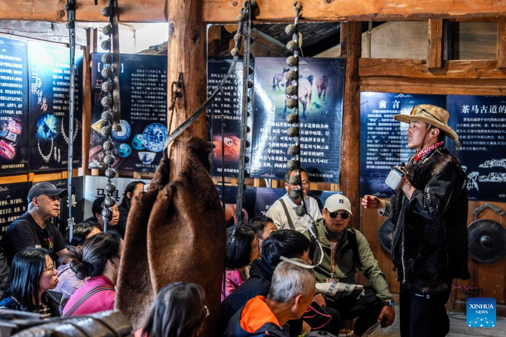 Yang Siyun (1st, R), a descendant of local horse train operators, tell stories of his ancestors to visitors at Sideng Village of Shaxi Town, Jianchuan County, southwest China's Yunnan Province, April 19, 2025. A remote town in Jianchuan County, Shaxi was once an important trading hub for tea, herbs, silks and salt on the ancient Tea Horse Road, a trade route dating back to the Tang Dynasty (618-907).