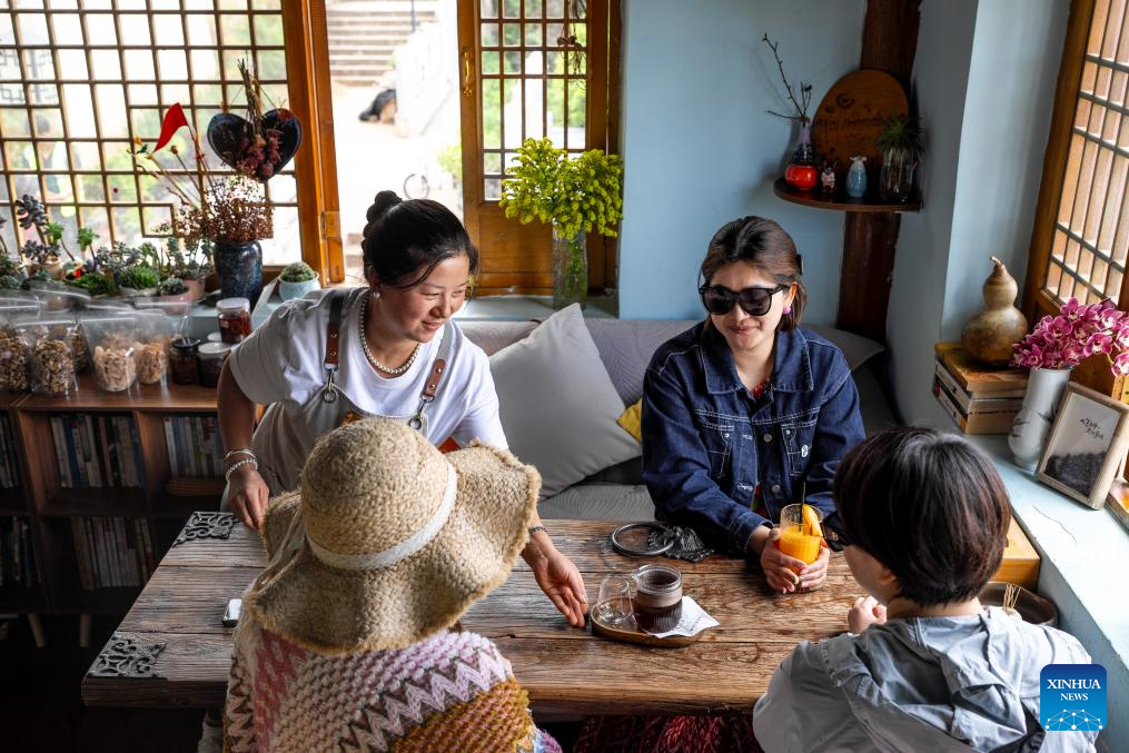 A villager serves coffee to tourists at Hualong Village of Shaxi Town, Jianchuan County, southwest China's Yunnan Province, April 20, 2025. A remote town in Jianchuan County, Shaxi was once an important trading hub for tea, herbs, silks and salt on the ancient Tea Horse Road, a trade route dating back to the Tang Dynasty (618-907).