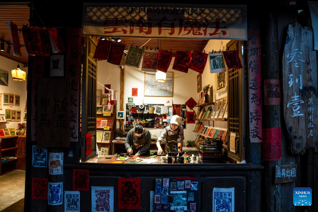 A tourist (L) tries to make a piece of local traditional woodblock print known as Jiama at Sideng Village of Shaxi Town, Jianchuan County, southwest China's Yunnan Province, April 18, 2025. A remote town in Jianchuan County, Shaxi was once an important trading hub for tea, herbs, silks and salt on the ancient Tea Horse Road, a trade route dating back to the Tang Dynasty (618-907).