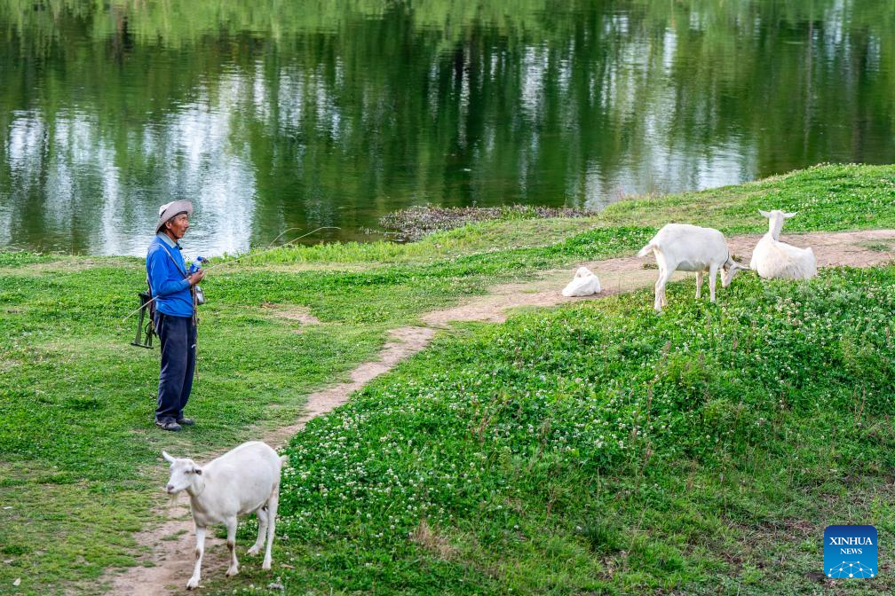 A villager herds sheep by a river in Beilong Village of Shaxi Town, Jianchuan County, southwest China's Yunnan Province, April 18, 2025. A remote town in Jianchuan County, Shaxi was once an important trading hub for tea, herbs, silks and salt on the ancient Tea Horse Road, a trade route dating back to the Tang Dynasty (618-907).