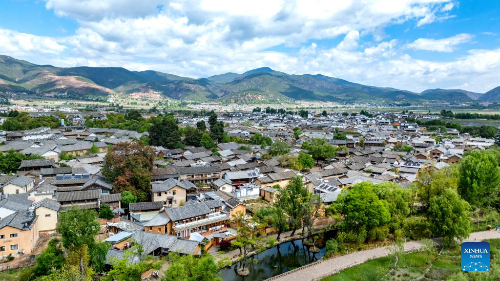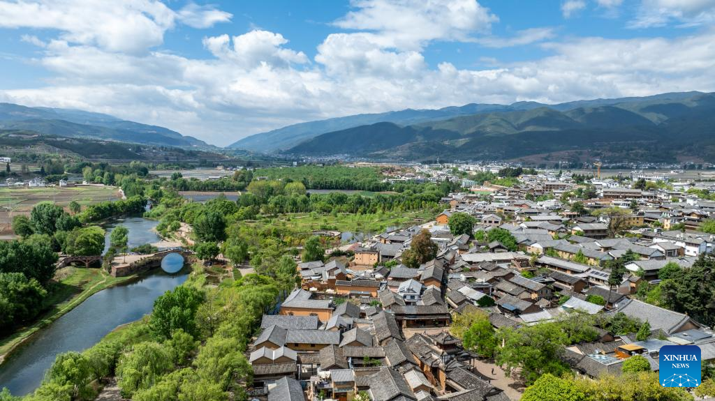 An aerial drone photo taken on April 21, 2025 shows the scenery of Sideng Village in Shaxi Town, Jianchuan County, southwest China's Yunnan Province. A remote town in Jianchuan County, Shaxi was once an important trading hub for tea, herbs, silks and salt on the ancient Tea Horse Road, a trade route dating back to the Tang Dynasty (618-907).