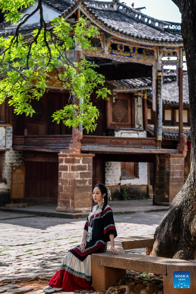 A tourist poses for a photo in front of an ancient stage at Sideng Village of Shaxi Town, Jianchuan County, southwest China's Yunnan Province, April 21, 2025. A remote town in Jianchuan County, Shaxi was once an important trading hub for tea, herbs, silks and salt on the ancient Tea Horse Road, a trade route dating back to the Tang Dynasty (618-907).