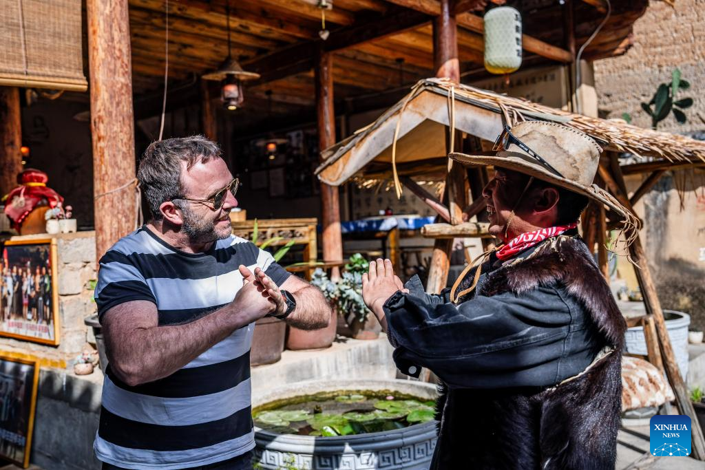 Yang Siyun (R), a descendant of local horse train operators, bids farewell to a foreign tourist at Sideng Village of Shaxi Town, Jianchuan County, southwest China's Yunnan Province, April 19, 2025. A remote town in Jianchuan County, Shaxi was once an important trading hub for tea, herbs, silks and salt on the ancient Tea Horse Road, a trade route dating back to the Tang Dynasty (618-907).
