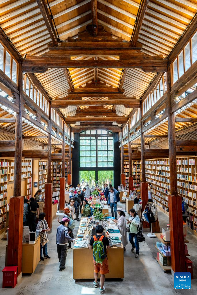 People visit a bookshop at Beilong Village of Shaxi Town, Jianchuan County, southwest China's Yunnan Province, April 20, 2025. A remote town in Jianchuan County, Shaxi was once an important trading hub for tea, herbs, silks and salt on the ancient Tea Horse Road, a trade route dating back to the Tang Dynasty (618-907).