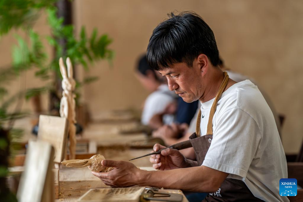 Shi Shunhua, a craftsman of Jianchuan woodcarving, works on a piece of artifact at Sideng Village of Shaxi Town, Jianchuan County, southwest China's Yunnan Province, April 19, 2025. A remote town in Jianchuan County, Shaxi was once an important trading hub for tea, herbs, silks and salt on the ancient Tea Horse Road, a trade route dating back to the Tang Dynasty (618-907).