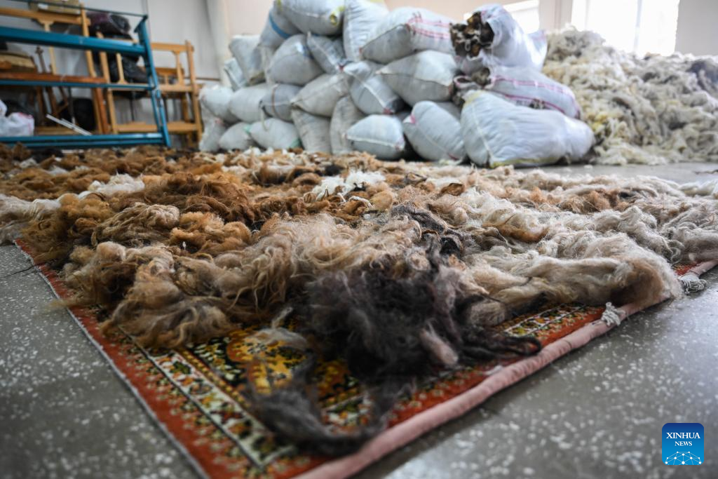 This photo taken on April 25, 2025 shows raw materials of wool at the Erzurum Maturation Institute in Erzurum, Türkiye. Erzurum, a province in northeastern Türkiye, has a long-standing tradition of wool weaving. Since the 1850s, Ehram, a finely spun wool fabric, has become a renowned local specialty. The production of Ehram involves multiple intricate processes. Initially utilized for women's garments, it has since been adapted for a variety of accessories, including handbags and belts. In recent years, the local government has actively promoted and supported the transmission and training of this textile craft to create more employment opportunities. (Xinhua/Liu Lei)