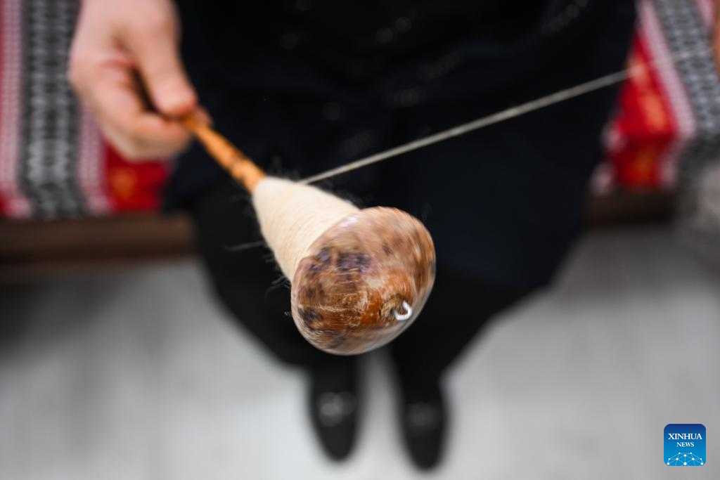 A worker twists wool into thread at the Erzurum Maturation Institute in Erzurum, Türkiye, on April 25, 2025. Erzurum, a province in northeastern Türkiye, has a long-standing tradition of wool weaving. Since the 1850s, Ehram, a finely spun wool fabric, has become a renowned local specialty. The production of Ehram involves multiple intricate processes. Initially utilized for women's garments, it has since been adapted for a variety of accessories, including handbags and belts. In recent years, the local government has actively promoted and supported the transmission and training of this textile craft to create more employment opportunities. (Xinhua/Liu Lei)