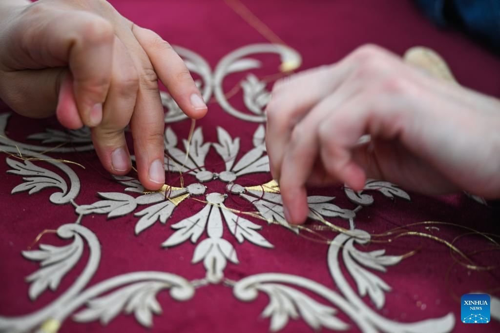 A worker embroiders on an Ehram product at the Erzurum Maturation Institute in Erzurum, Türkiye, on April 25, 2025. Erzurum, a province in northeastern Türkiye, has a long-standing tradition of wool weaving. Since the 1850s, Ehram, a finely spun wool fabric, has become a renowned local specialty. The production of Ehram involves multiple intricate processes. Initially utilized for women's garments, it has since been adapted for a variety of accessories, including handbags and belts. In recent years, the local government has actively promoted and supported the transmission and training of this textile craft to create more employment opportunities. (Xinhua/Liu Lei)