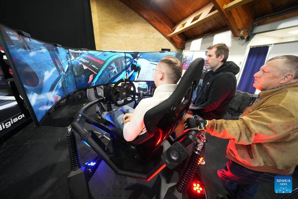 Visitors experience a driving simulator during the Baltic Motor Show Riga "Auto 2025" in Riga, Latvia, April 27, 2025. (Photo by Edijs Palens/Xinhua)