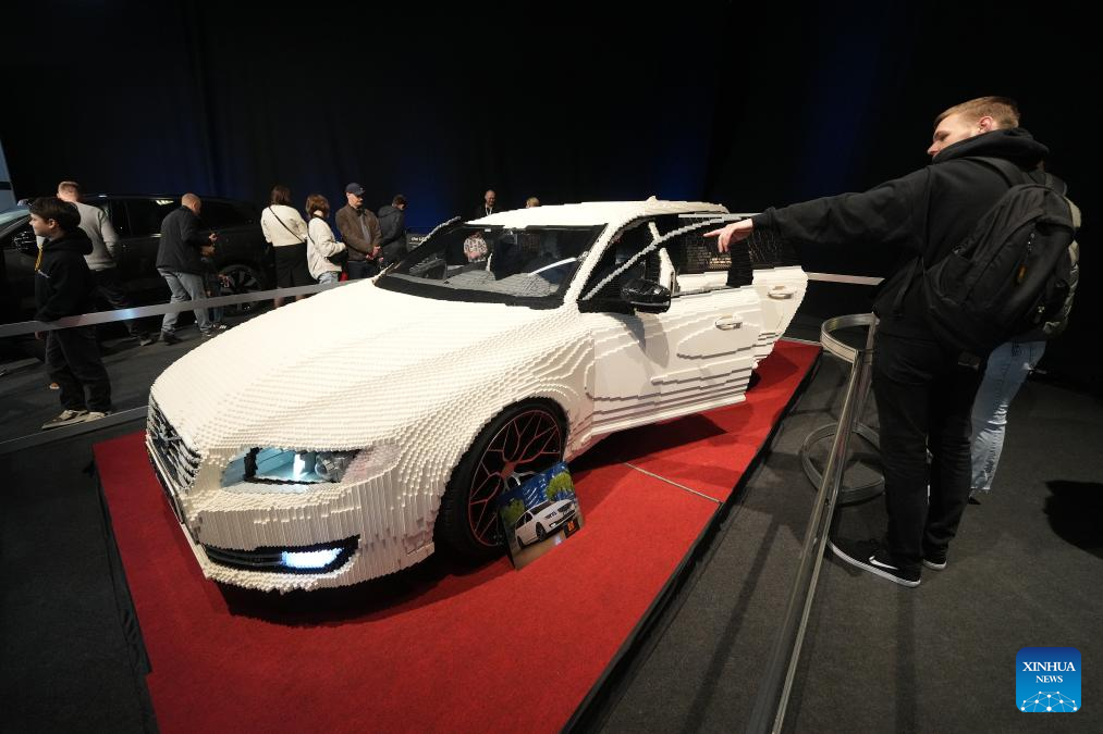 A model Volvo car made of Lego bricks is displayed during the Baltic Motor Show Riga "Auto 2025" in Riga, Latvia, April 27, 2025. (Photo by Edijs Palens/Xinhua)