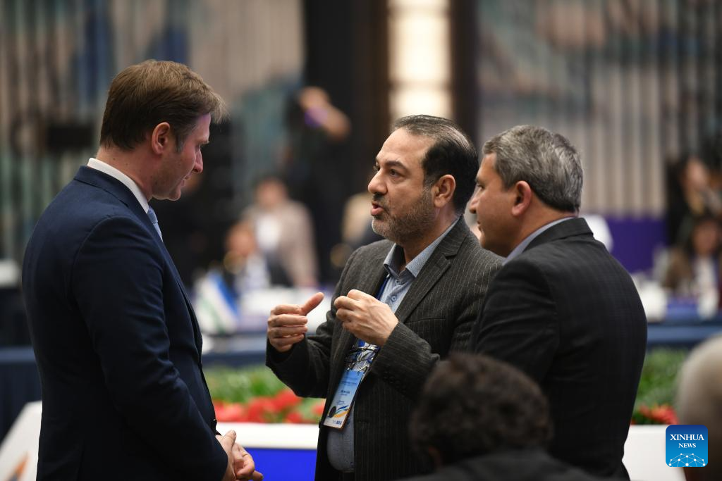 Guests communicate during the eighth Shanghai Cooperation Organization (SCO) Health Ministers' Meeting in Xi'an, northwest China's Shaanxi Province, April 28, 2025. (Xinhua/Zhang Bowen)