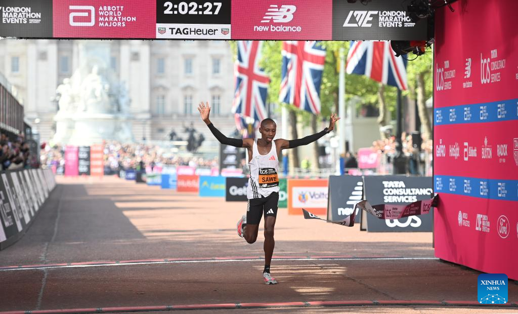 Sabastian Sawe of Kenya celebrates after winning the men's elite race of the 2025 London Marathon in London, Britain, April 27, 2025. (Xinhua/Jia Yuchen)