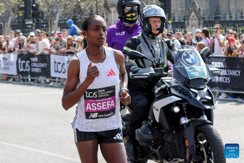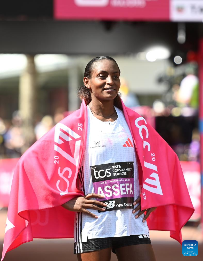 Tigst Assefa of Ethiopia poses after the women's elite race of the 2025 London Marathon in London, Britain, April 27, 2025. (Xinhua/Jia Yuchen)
