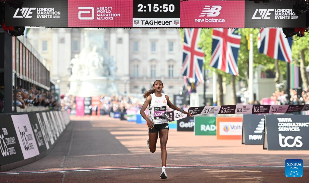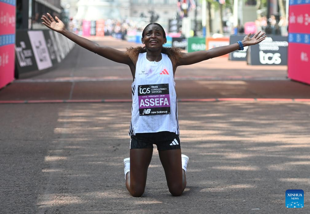Tigst Assefa of Ethiopia crosses the finish line during the women's elite race of the 2025 London Marathon in London, Britain, April 27, 2025. (Xinhua/Jia Yuchen)