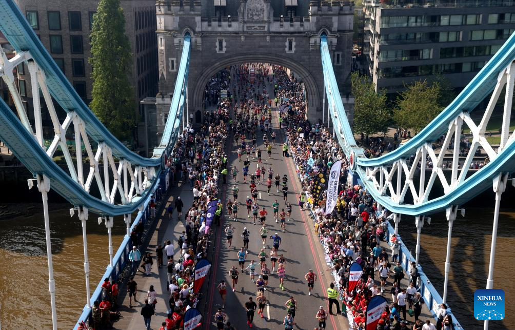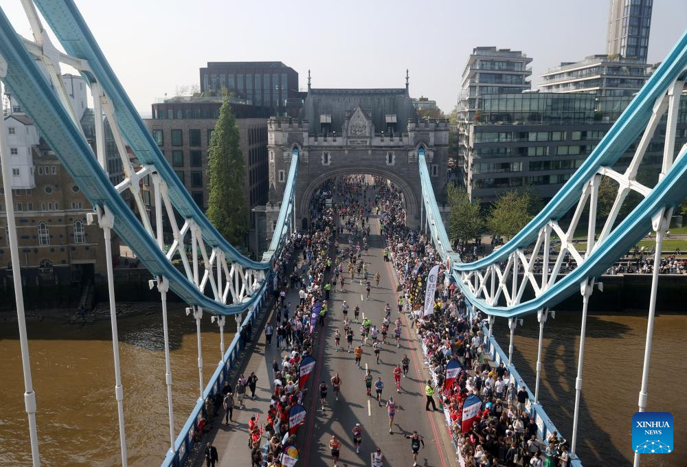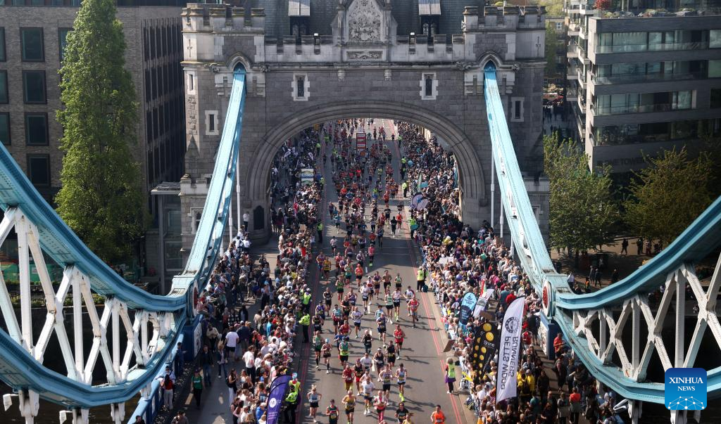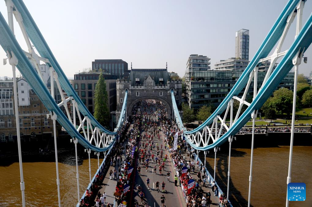 Athletes run through Tower Bridge at the 2025 London Marathon in London, Britain, April 27, 2025. (Xinhua/Li Ying)