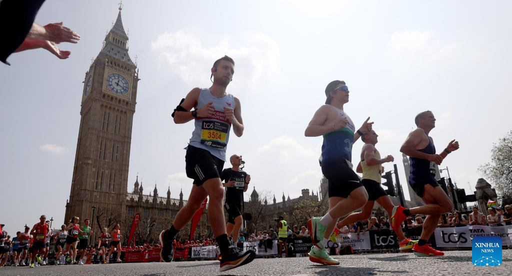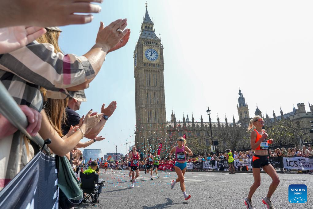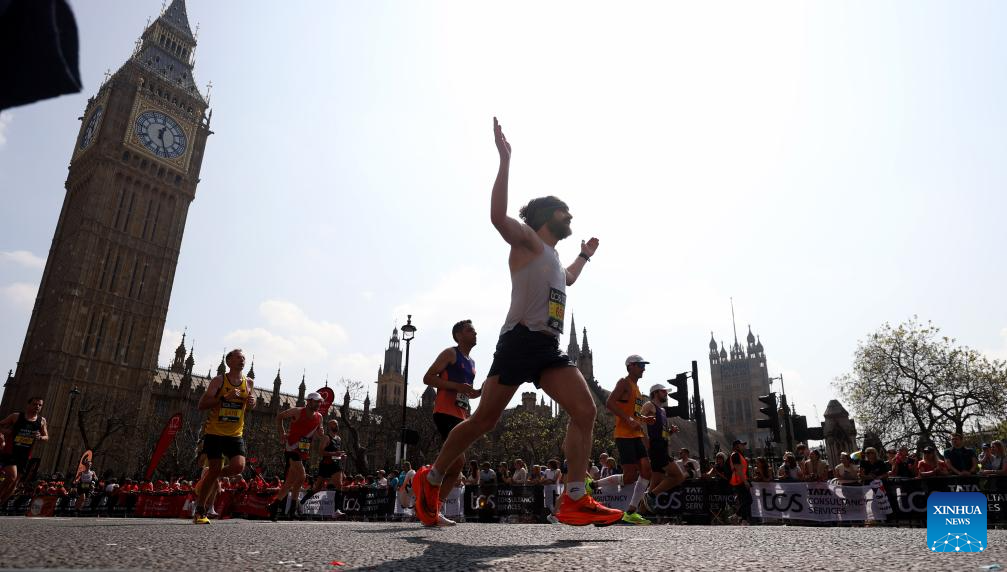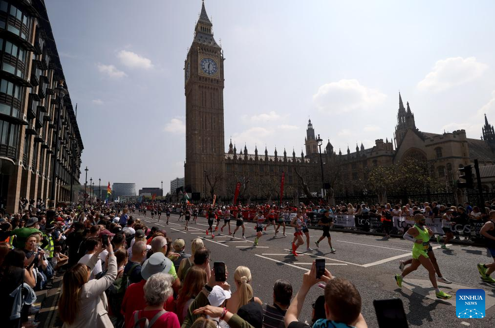Athletes run past the Big Ben at the 2025 London Marathon in London, Britain, April 27, 2025. (Xinhua/Wu Lu)
